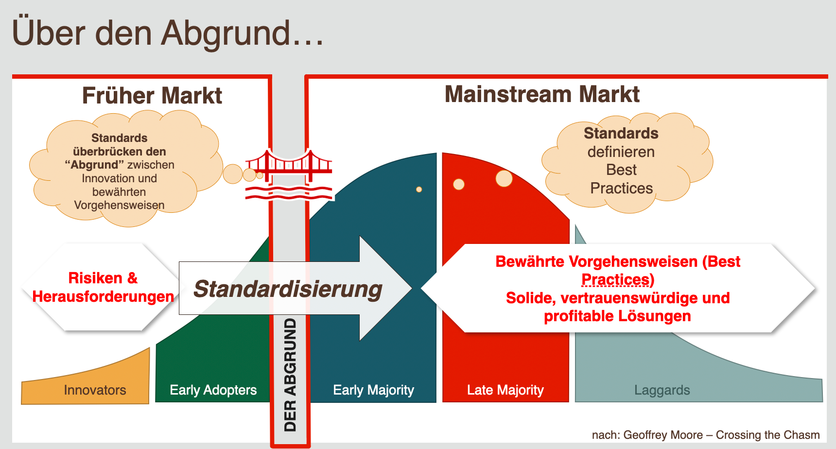 Standards können die Kluft zwischen beiden Gruppen überbrücken, weil sie Best Practices definieren und so den Grundstein für Innovationen legen, die vom Mainstream-Markt angenommen werden können. Dies kann eine wichtige Rolle spielen, insbesondere bei neuen Dingen wie BIM und Digitalisierung, wo die Vorteile nicht immer so glasklar auf der Hand liegen und Lösungen der Mitbewerber nicht so deutlich differenziert werden können.